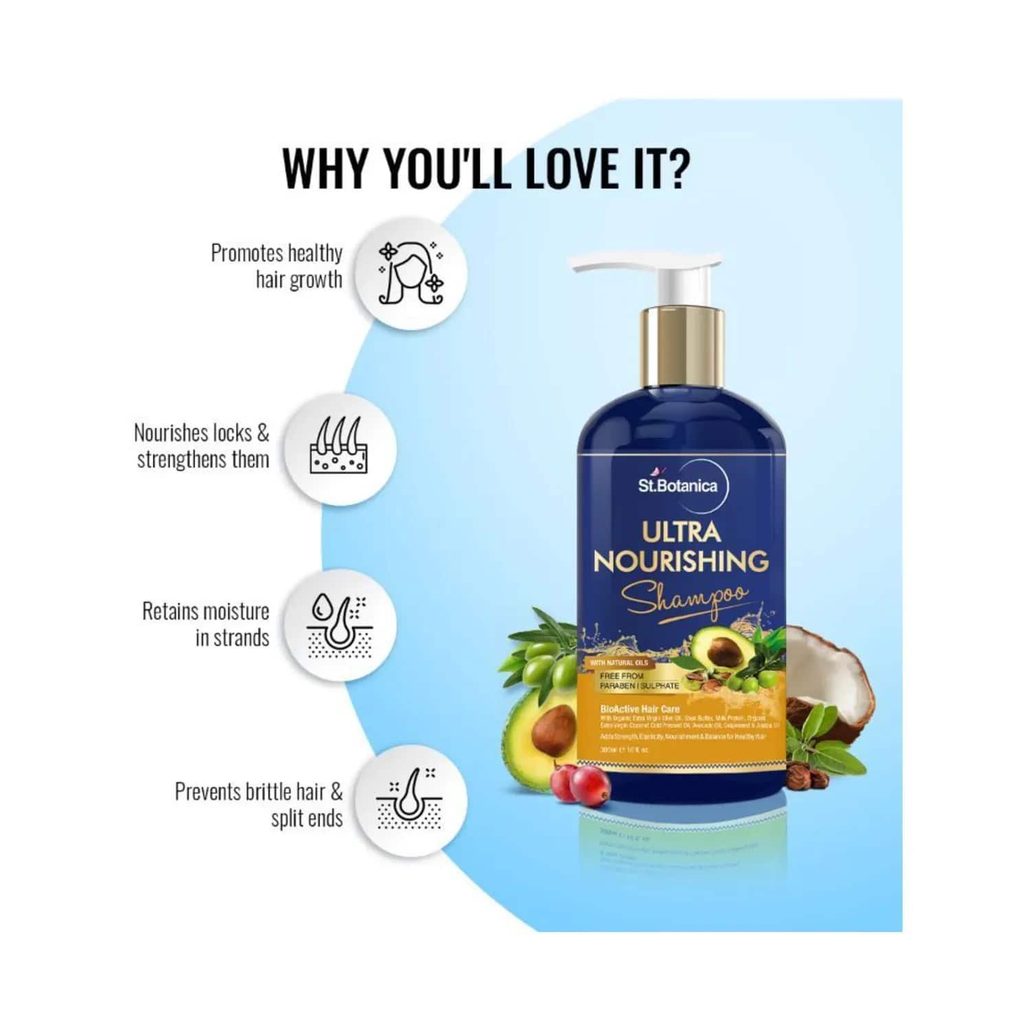 Perfect your hair flip with the St.Botanica Ultra Nourishing Hair Shampoo - (300ml). This strengthening shampoo improves the elasticity of your strands while the potent botanical formulation leaves it denser, stronger, smoother, and lustrous. The hydrating shampoo gently cleanses and repairs your locks from scalp to tip to revive healthy hair.Key Features & Benefits:Botanical ingredients preserve the natural shine of your hairNourishing shampoo hydrates the tressesCleanses impurities and residues for clean scalp and hairImproves the tone and texture to smoothen your maneRepairing shampoo minimises the effects of sun and heat damageAdds volume and revives dull strands to make them healthierKey Ingredients:Neem: Reduces hair fallJojoba oil: Moisturises hair and controls frizzAloe vera: Hydrates and soothes hairHow to Use:Rinse hair thoroughly and massage shampoo into your scalp. Leave the lather on your hair and scalp for a few minutes before washing it off.All Ingredients:Purified Water, Decyl Glucoside, Cocamidopropyl Betaine (Derived From Coconut)*, Sodium Cocoyl Isethionate (Derived From Coconut)*, Acrylates Copolymer, Glycerin, Coco-Glucoside (And) Glyceryl Oleate, Propanediol, Cocodiethanolamide (Derived From Coconut)*, Ethylene Glycol Distearate, Hydroxyethyl Urea, Jasmine Essential Oil*, Guar Hydroxypropyltrimonium Chloride, D Panthenol (Pro-Vitamin B5), Aloe Vera Extract*, Disodium Edta, Polyquaternium 10, Methylchloroisothiazolinone, Organic Extra Virgin Olive Oil*, Shea Butter*, Milk Powder*, Organic Extra Virgin Coconut Cold Pressed Oil*, Avocado Cold Pressed Oil*, Grapeseed Cold Pressed Oil*, Neem Leaf Extract*, Pure Golden Jojoba Cold Pressed Oil*, Citric AcidAbout the Brand:Founded in 2015 by Sahil Mehta, St. Botanica offers a wide range of skincare and hair care products based on nature and natural botanicals. The brand aims to make premium self-care products accessible to thousands of customers worldwide by making them affordable and cost-effective. Always emphasising quality and authenticity, St. Botanica curates products that are dermatologically tested, cruelty-free, and manufactured in India with ethically sourced skin-friendly ingredients.