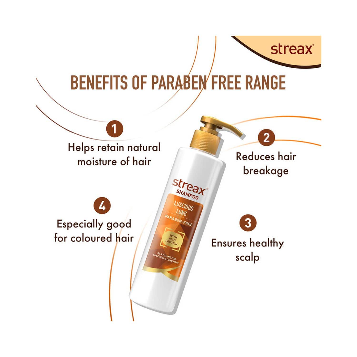Get beautiful, manageable hair with the Streax Luscious Long Conditioner (240ml). It is infused with rich proteins to intensely hydrate, soften, and smoothen your hair from within. This moisturizing conditioner also lends an instant shine to the hair while decreasing breakage. Formulated especially for colored hair, this Streax conditioner ensures reduced damage and optimal hair and scalp health.Key Features & Benefits:Nourishing conditioner with rich proteins offers intense hydrationReduces hair breakage and keeps scalp healthyMakes hair soft, shiny, and manageableParaben-free formula safe for hair and scalp useAll Ingredients:Flaxseed Protein, Vitamin EHow to Use:Cleanse your hair. Then, take a little conditioner and apply it to the length and ends of your hair. Let it stay for 1 or 2 minutes and rinse off well. Finally, dry your hair with a soft towel.About the Brand:Launched in 2004, Streax is the first domestically manufactured Indian hair color brand. Since its launch, the brand has revolutionized the hair-care market by introducing hair colors that not only cover grey hair but inspire women to be confident in choosing their style. With time, this brand expanded its consumers by understanding the needs of modern Indian women. Now, it crafts a wide range of hair care products, from hair serums to highlight kits, all available on a cost-effective budget and formulated without chemicals.Check out more Streax Conditioner options here, or browse through tokocart's full range of Conditioner from top global brands.You can also explore other products from the world of Streax here on tokocart.