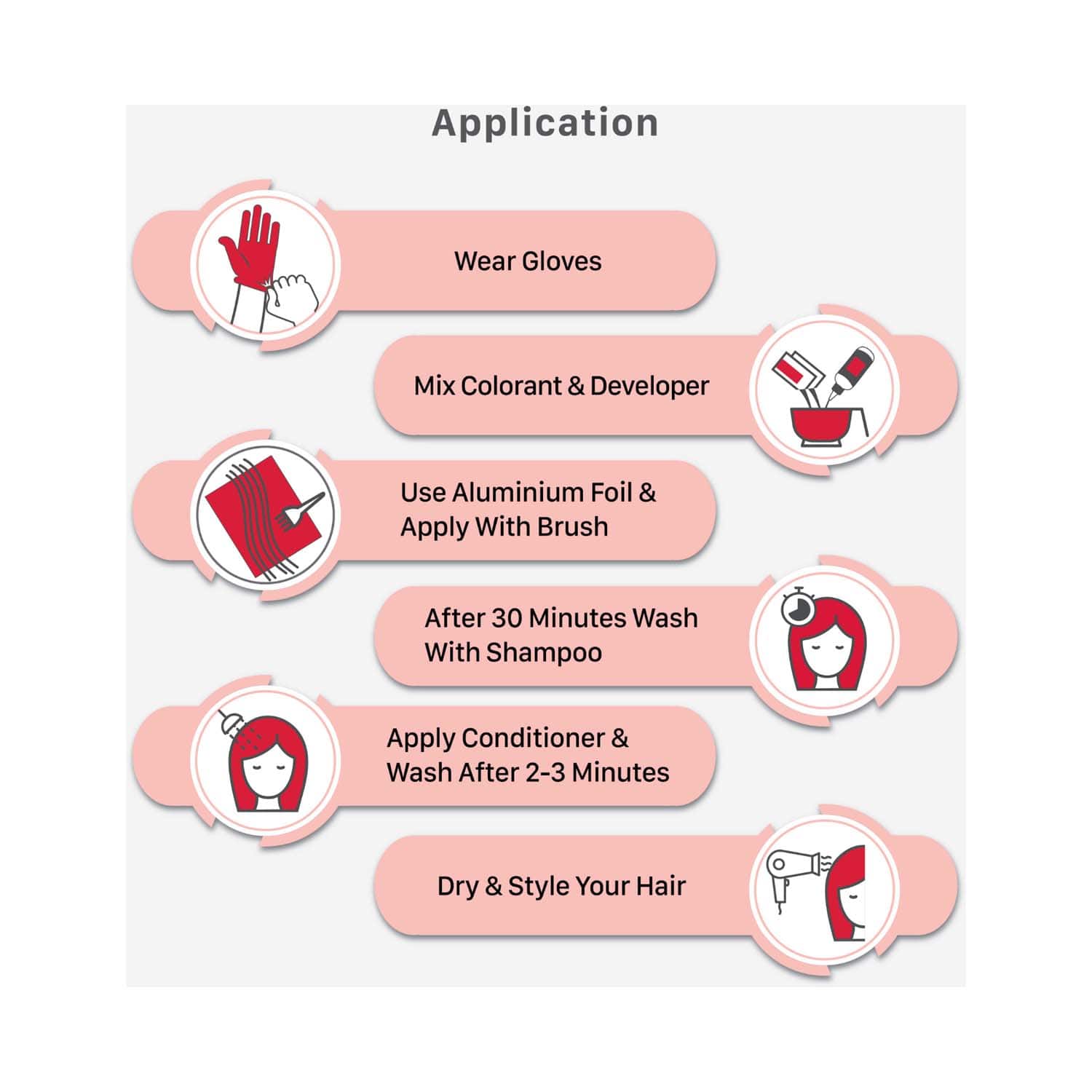 How to Use:Wear the gloves, then mix the blonder and developer until they are thoroughly blended. Hold a piece of aluminum foil below a hair strand, apply the mixture with the brush, then fold the foil over it. Repeat the process until all the target hair strands are covered. Wait for 30 minutes, then wash it off with shampoo and dry. Wear the gloves once more, then apply the colorant to your hair using the brush. Leave it in for 30 minutes, then shampoo it off thoroughly. Follow it up with conditioner and leave it in for 2-3 minutes. Rinse it off, then dry and style your hair.