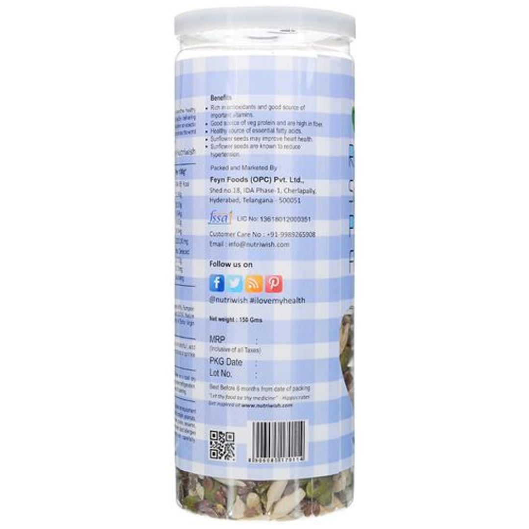 Nutriwish brings to you Roasted Sunflower Pumpkin & Flax Seeds that are loaded with health benefits and nutrients. It is perfectly crunchy and is 100% natural and high-quality. These seeds are slightly roasted to get maximum health benefits and the right crunch. This combination of seeds contains vitamins, minerals, essential amino acids, antioxidants, fatty acids, etc. that are important for your health. It is a great mid-meal snack, sprinkled over breakfast or soups.