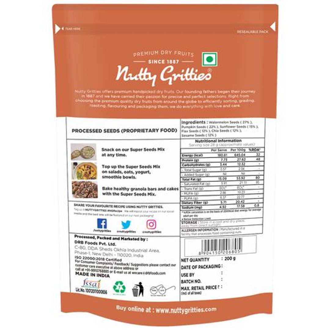 Nutty Gritties brings to you Super Seeds Mix that are loaded with health benefits and nutrients. It is a perfectly crunchy and is 100% natural and high-quality. These seeds are slightly roasted to get maximum health benefits and the right crunch. The mix contains pumpkin, watermelon, sunflower seeds, flax seeds, sesame seeds, soynuts, chia seeds. These combination of seeds contains vitamins, minerals, essential amino acids, antioxidants, fatty acids, etc. that are important for your health. It is a great mid meal snack, sprinkled over breakfast or soups.