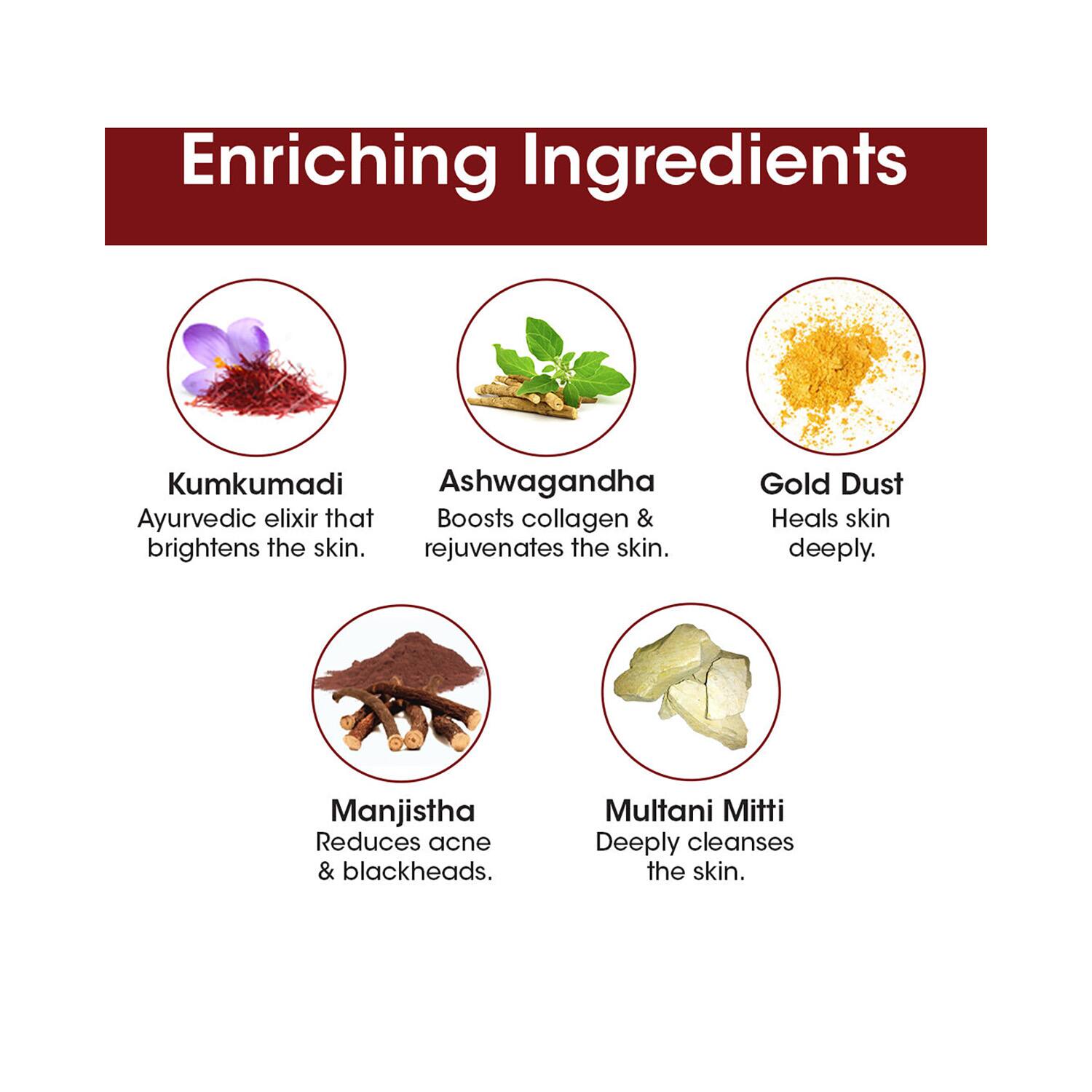 All Ingredients:Kumkumadi Ext, Gold Dust, Manjistha, Moringa, Rose Powder, Bala Ext, Sandalwood Ext, Aloe Vera Ext, Orange Peel Ext, Tulsi Powder Ext, Sodium Lauroyl Sarcosinate, Cocoa-Glucoside, Decyl Glucoside, Cocamidopropyl Betaine, Polyquaternium 7, Sorbitol, Dmdm Hydantoin, Methylchloroisothiazolinone, Cocodiethanol Amide, Dm Water.