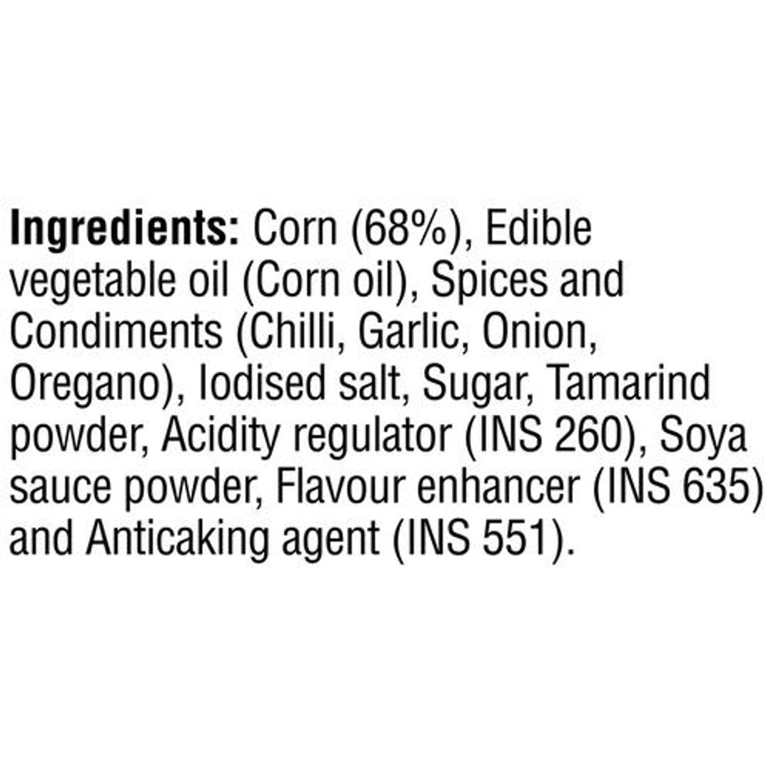 Corn (68%), Edible Vegetable Oil (Corn Oil), Spices and Condiments (Chilli, Garlic, Onion, Oregano), Iodised Salt, Sugar, Tamarind Powder, Acidity Regulator (E260), Soya Sauce Powder, Flavour Enhancer (E635), Anticaking Agent (E551).