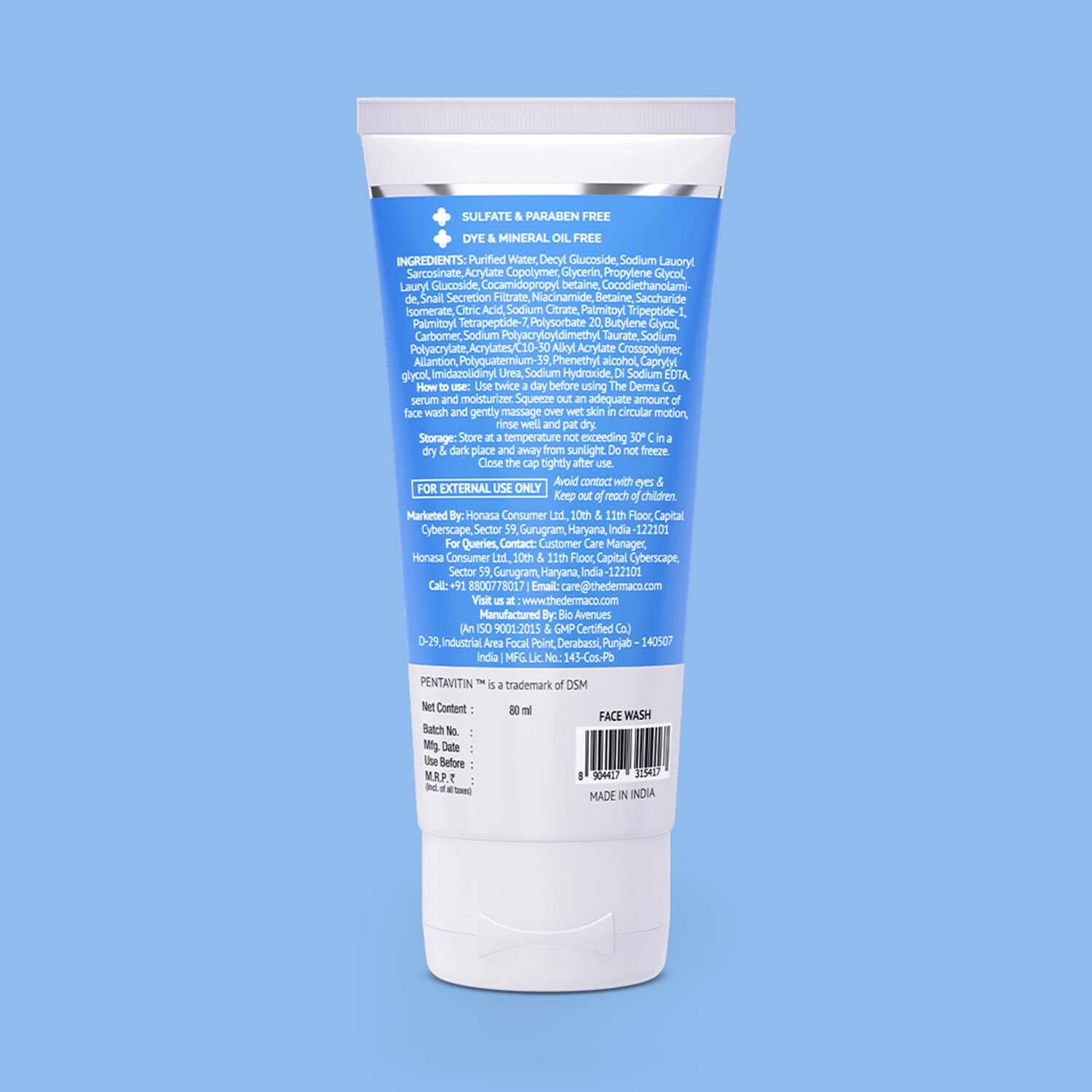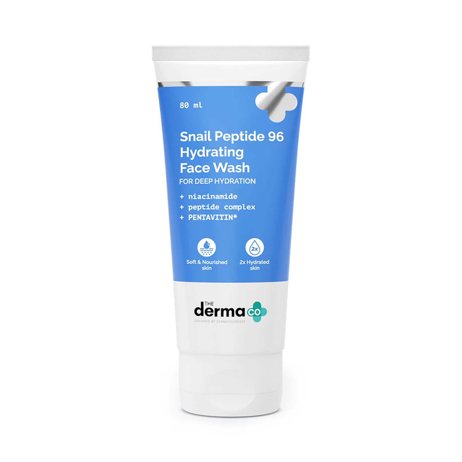 Unveil smoother, hydrated skin with the The Derma Co Snail Peptide 96 Hydrating Face Wash (80 ml). This refreshing gel isn't just about cleansing—it's a moisture-locking miracle that drenches skin in 2X hydration, keeping it supple all day. Infused with 96% pure snail secretion filtrate, it nourishes deeply while peptides work their magic to enhance collagen production, promoting smoother, firmer skin. Thanks to niacinamide, excess oil is tamed, discoloration is evened out, and those pesky dark spots and acne scars are visibly diminished. Say goodbye to dullness and hello to a revitalized, purified canvas with every wash.Key Features & Benefits:Non-drying gel formula provides 2X hydration and locks in optimum moistureContains 96% pure snail secretion filtrate that nourishes and revitalizes skin deeplyInfused with collagen-boosting peptides to improve skin elasticity and texture for a smoother complexionEnriched with niacinamide to control excess oil, reduce discoloration, and fade dark spots and acne scarsCleanses away dirt and impurities without drying out the skinSuitable for all skin types, it is free from mineral oil, dye, parabens, and sulphatesKey Ingredients:Snail peptide: Supports skin regeneration and repair, aiding in wound healing and improving overall skin textureAll Ingredients:Myristic Acid, Glycerin, Aqua, Potassium Hydroxide, Propylene Glycol, Stearic Acid, Decyl Glucoside, Lauric Acid, Glycol Distearate, Cocamidopropyl Betaine, Xylitol, Glucose, Anhydroxylitol, Phoenix Dactylifera (Date Palm) Extract, Kojic Acid Dipalmitate, Niacinamide, Sodium Pca, Glyceryl Stearate, Phenoxyethanol, Polyquaternium-7, Titanium Dioxide, Sodium Metabisulfite, Butylated Hydroxytoluene, Vitamin E, Pentaerythrityl Tetra-Di-T-Butyl Hydroxyhydrocinnamate, Disodium Edta, Glyceryl Glucoside And Alpha Arbutin.