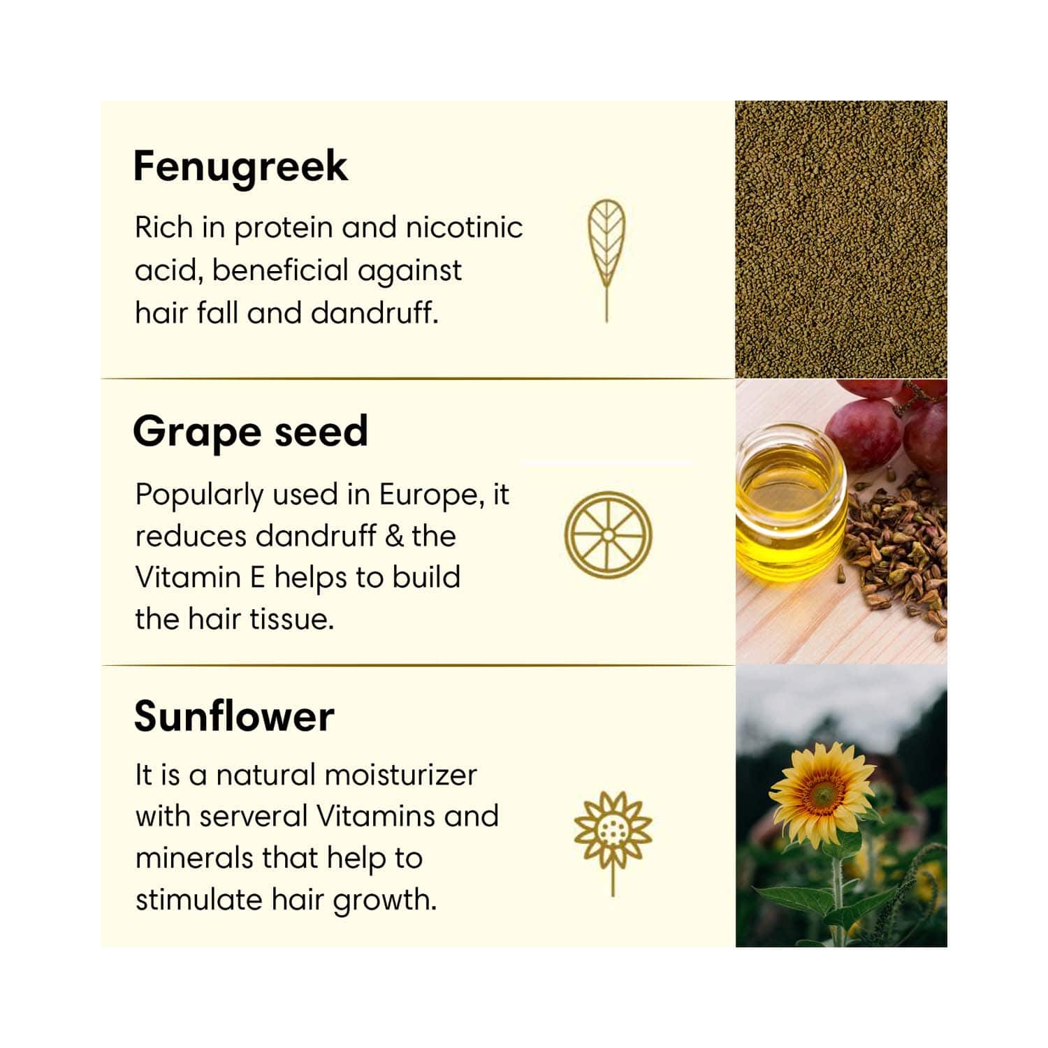 Key Ingredients:Fenugreek: Fights hair fall and dandruffGrapeseed oil: Reduces dandruffVitamin E: Builds the hair tissueSunflower: Moisturizes the hair and stimulates hair growth