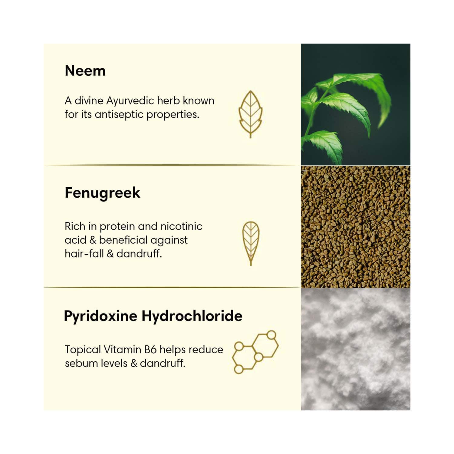 Key Ingredients:Neem: Has antiseptic propertiesFenugreek: Prevents hair fall and dandruffPyridoxine hydrochloride: Absorbs oil and prevents dandruff