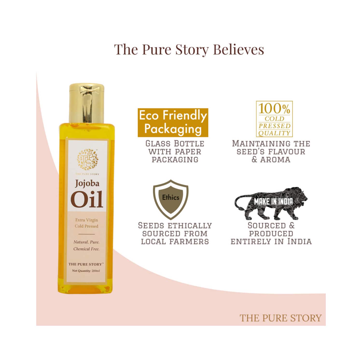 Revitalize your skin with the nourishment offered by the The Pure Story Jojoba Oil (200ml). Lightweight and vitamin-rich, this natural cold-pressed oil penetrates deep into your skin to provide deep moisturization. It improves healing and regeneration, making it ideal for dealing with dry skin, signs of aging, dull hair, and cracked heels.Key Features & Benefits:Infused with jojoba oil, vitamin C, and vitamin E to nourish the skin from the inside out and protect it from environmental damageNon-greasy formula nourishes skin and hair and makes them shine without clogging pores or causing build-upMultipurpose oil that improves skin tone and elasticity, promotes hair growth, heals cracked skin on heels, and can be used as carrier oilOrganic oil that keeps you and your hair and skin healthyKey Ingredients:Jojoba oil: Deep moisturizing and nourishing propertiesVitamin E: Heals and protects from damageVitamin C: Promotes collagen productionHow to Use:For face: First, wash your face and pat dry with a soft towel. Then, take a few drops of oil and massage your face gently in circular strokes. You must massage for at least 1 minute to properly absorb face oil in the skin. It is recommended to apply face oil on moist skin only.For hair: Apply the oil on your scalp using your fingertips. Gently massage for 10-15 minutes. Keep the hair oil overnight or wash using a mild shampoo after at least 30 minutes.All Ingredients:100% Pure Jojoba OilAbout the Brand:Established in 2019 by Sahil Pahwa, The Pure Story Essential is a line of anti-aging cosmetics that aim to solve various skin concerns. The brand formulates its products by combining carefully chosen components blended in the right concentrations and proportions. The products don't include preservatives, gluten, or animal products to ensure safe and guilt-free use. The Pure Story is also known to use environment-friendly packaging to offer effective skincare solutions without affecting the environment.Check out more The Pure Story Hair Oil options here, or browse through tokocart's full range of Hair Oil from top global brands.You can also explore other products from the world of The Pure Story here on tokocart.