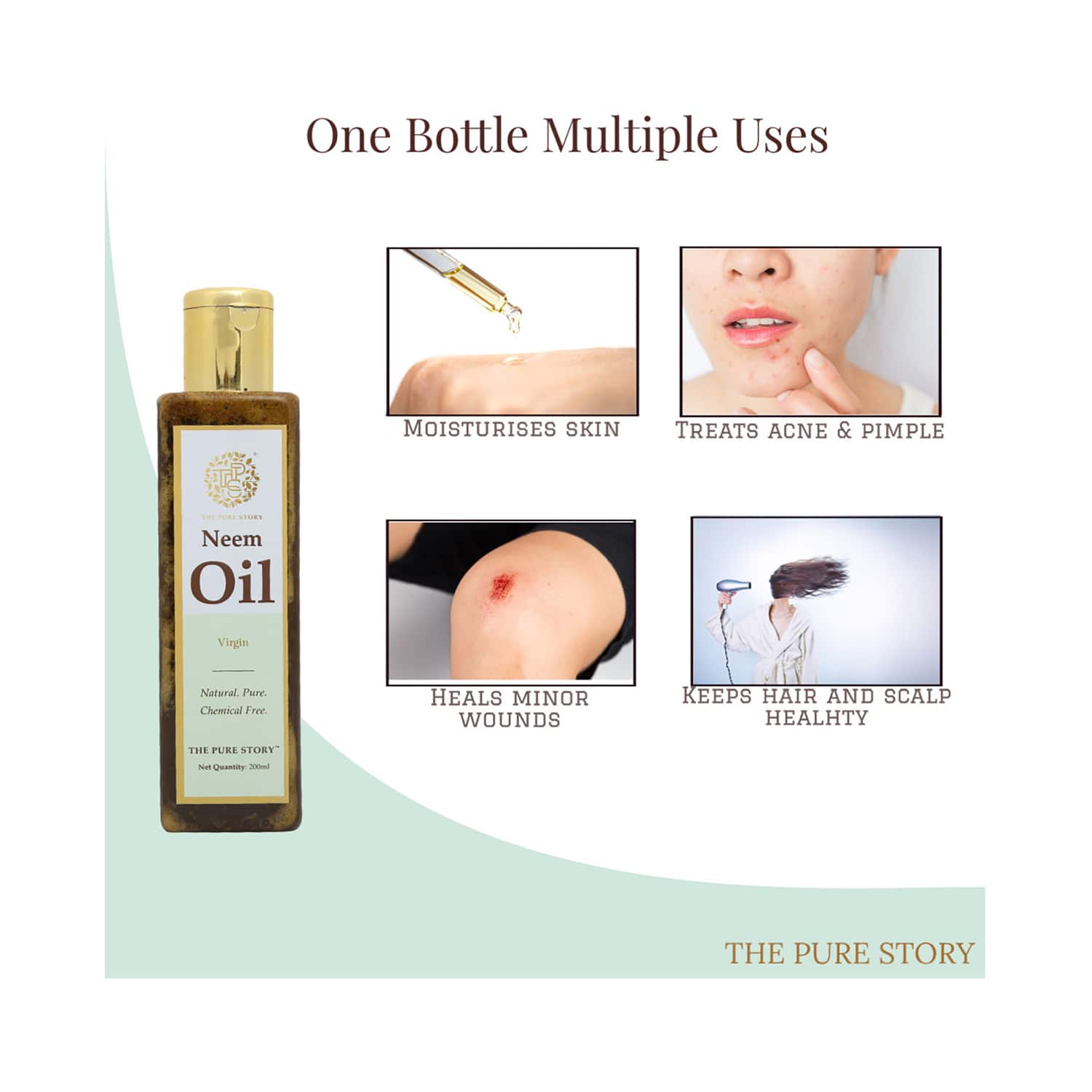 Protect your skin and hair with the The Pure Story Neem Oil (100ml). This natural cold-pressed oil is rich in fatty acids and antioxidants and designed to improve rejuvenation and blood circulation. Its effect on collagen production smoothens skin texture, strengthens air, treats acne and dandruff, and protects them from sun damage, keeping your skin and hair looking fresh and nourished.Key Features & Benefits:Enriched with neem oil to promote collagen production and protect from sun damageMoisturizes the skin and hair deeplyMultipurpose oil that helps heal wounds, treats acne and dandruff, promotes hair growth, and has anti-inflammatory properties that improve circulationOrganic oil that keeps you and your hair and skin healthyKey Ingredients:Neem oil: Promotes collagen production and protects from sun damageHow to Use:For face: First, wash your face and pat dry with a soft towel. Then, take a few drops of oil and massage your face gently in circular strokes. You must massage for at least 1 minute to properly absorb face oil in the skin. It is recommended to apply face oil on moist skin only.For hair: Apply the oil on your scalp using your fingertips. Gently massage for 10-15 minutes. Keep the hair oil overnight or wash using a mild shampoo after at least 30 minutes.All Ingredients:100% Pure Neem OilAbout the Brand:Established in 2019 by Sahil Pahwa, The Pure Story Essential is a line of anti-aging cosmetics that aim to solve various skin concerns. The brand formulates its products by combining carefully chosen components blended in the right concentrations and proportions. The products don't include preservatives, gluten, or animal products to ensure safe and guilt-free use. The Pure Story is also known to use environment-friendly packaging to offer effective skincare solutions without affecting the environment.Check out more The Pure Story Hair Oil options here, or browse through tokocart's full range of Hair Oil from top global brands.You can also explore other products from the world of The Pure Story here on tokocart.