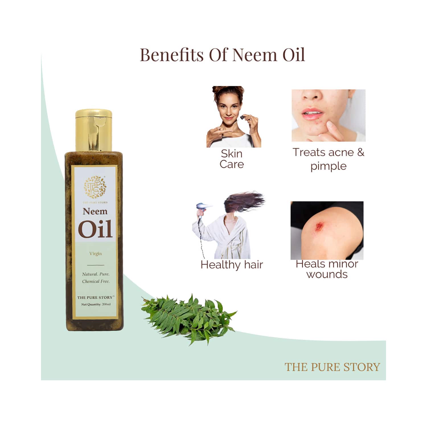 Refresh your skin and make it glow by using the The Pure Story Neem Oil (200ml). The protection offered by this natural cold-pressed oil keeps your hair and skin safe from sun damage. It increases collagen production, which makes it ideal for treating acne, dandruff, and dry and damage-prone skin and hair, and it hydrates effectively to make you feel fresh and energized all day.Key Features & Benefits:Enriched with neem oil to promote collagen production and protect from sun damageMoisturizes the skin and hair deeplyMultipurpose oil that helps heal wounds, treats acne and dandruff, promotes hair growth, and has anti-inflammatory properties that improve circulationOrganic oil that keeps you and your hair and skin healthyKey Ingredients:Neem oil: Promotes collagen production and protects from sun damageHow to Use:For face: First, wash your face and pat dry with a soft towel. Then, take a few drops of oil and massage your face gently in circular strokes. You must massage for at least 1 minute to properly absorb face oil in the skin. It is recommended to apply face oil on moist skin only.For hair: Apply the oil on your scalp using your fingertips. Gently massage for 10-15 minutes. Keep the hair oil overnight or wash using a mild shampoo after at least 30 minutes.All Ingredients:100% Pure Neem OilAbout the Brand:Established in 2019 by Sahil Pahwa, The Pure Story Essential is a line of anti-aging cosmetics that aim to solve various skin concerns. The brand formulates its products by combining carefully chosen components blended in the right concentrations and proportions. The products don't include preservatives, gluten, or animal products to ensure safe and guilt-free use. The Pure Story is also known to use environment-friendly packaging to offer effective skincare solutions without affecting the environment.