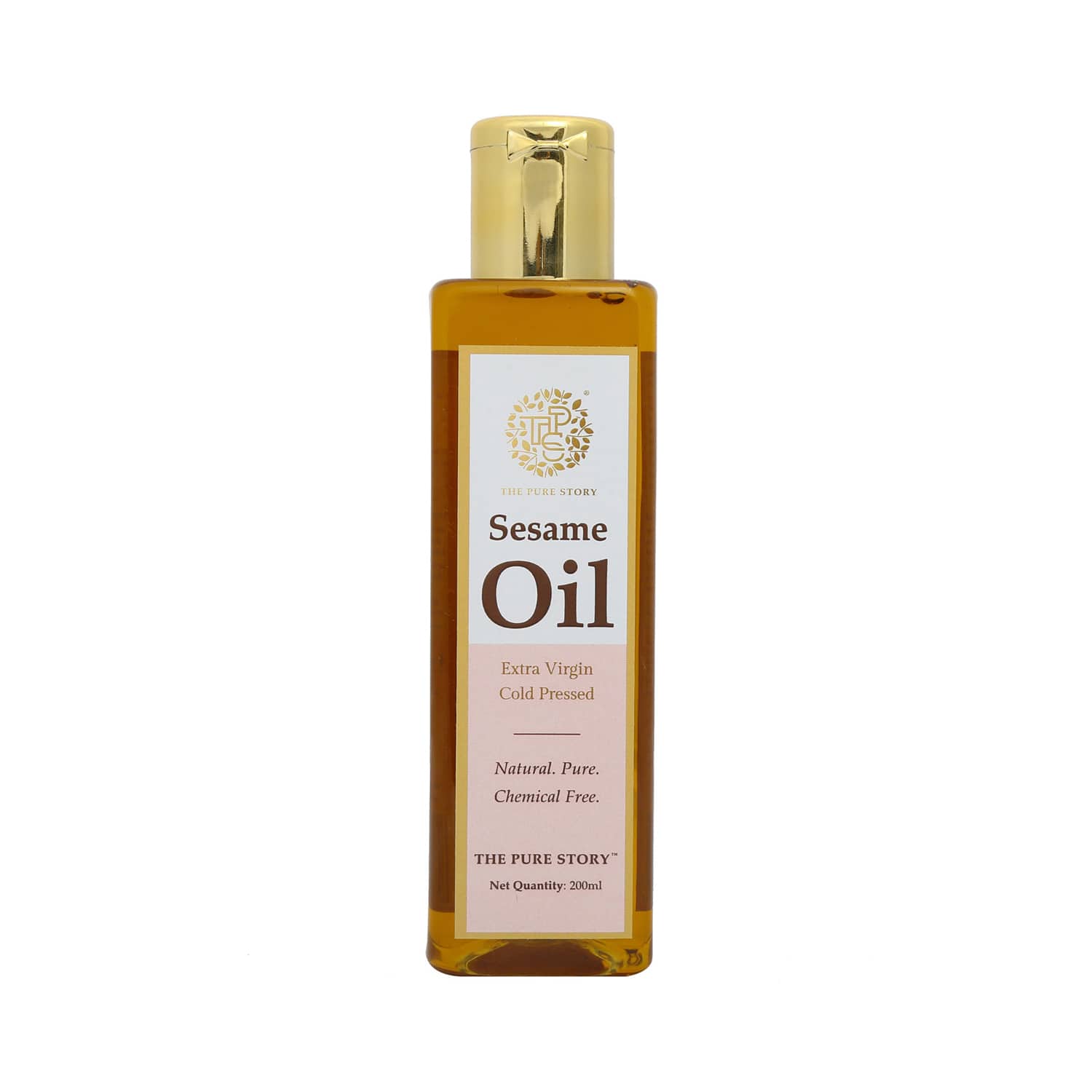 Look and feel your best with the rejuvenating properties of the The Pure Story Sesame Oil (200ml). Rich in antioxidants and vitamins, this natural cold-pressed oil deeply nourishes your skin and conditions your scalp. By increasing collagen production and stimulating the follicles, it promotes hair growth, improves skin texture, and protects you from sun damage, giving your hair and skin a look of health and nourishment.Key Features & Benefits:Infused with sesame oil to soothe the skin and relieve dandruff, dryness, and itchiness with its anti-inflammatory propertiesHigh protein content that moisturizes and nourishes skin and hair from the inside outMultipurpose oil that relieves joint and muscle pain, controls blood pressure, and cholesterol when consumed, improves brain functioning, and can be used in cooking to enhance taste and healthOrganic oil that keeps you and your hair and skin healthyKey Ingredients:Sesame oil: Soothes and rejuvenates skinHow to Use:For face: First, wash your face and pat dry with a soft towel. Then, take a few drops of oil and massage your face gently in circular strokes. You must massage for at least 1 minute to properly absorb face oil in the skin. It is recommended to apply face oil on moist skin only.For hair: Apply the oil on your scalp using your fingertips. Gently massage for 10-15 minutes. Keep the hair oil overnight or wash using a mild shampoo after at least 30 minutes.All Ingredients:100% Pure Sesame OilAbout the Brand:Established in 2019 by Sahil Pahwa, The Pure Story Essential is a line of anti-aging cosmetics that aim to solve various skin concerns. The brand formulates its products by combining carefully chosen components blended in the right concentrations and proportions. The products don't include preservatives, gluten, or animal products to ensure safe and guilt-free use. The Pure Story is also known to use environment-friendly packaging to offer effective skincare solutions without affecting the environment.