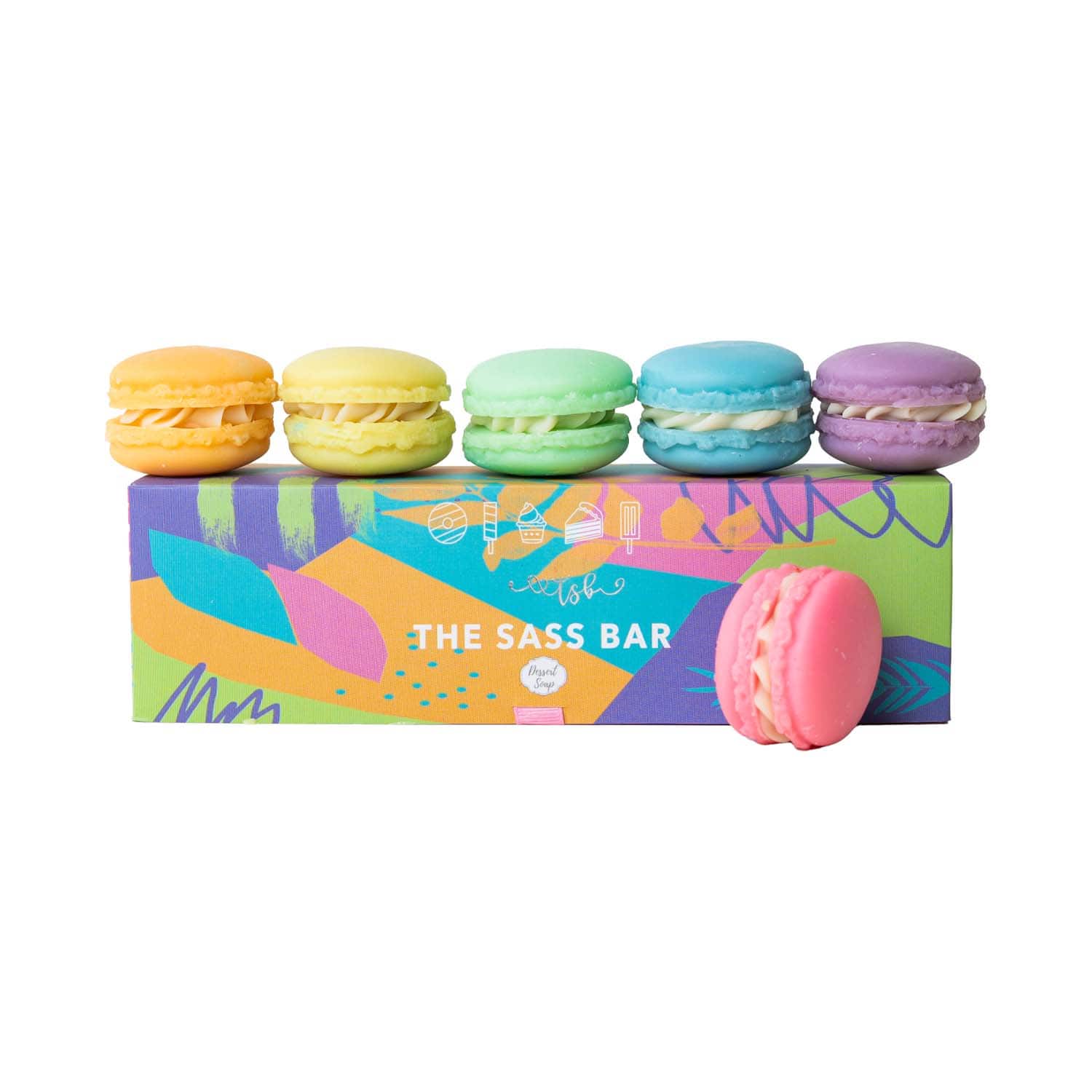 Give your skin a nourishing cleanse with the The Sass Bar Macaron Soap Box - (6 pcs). This macaron soap set contains six macaron-shaped soaps made using natural and safe ingredients to cleanse and nourish your skin. The Sass Bar soap set is enriched with virgin coconut oil to moisturize and heal dry skin. Also, this handmade soap set is perfumed with notes of vanilla and dessert-like scents for an uplifting sensation.