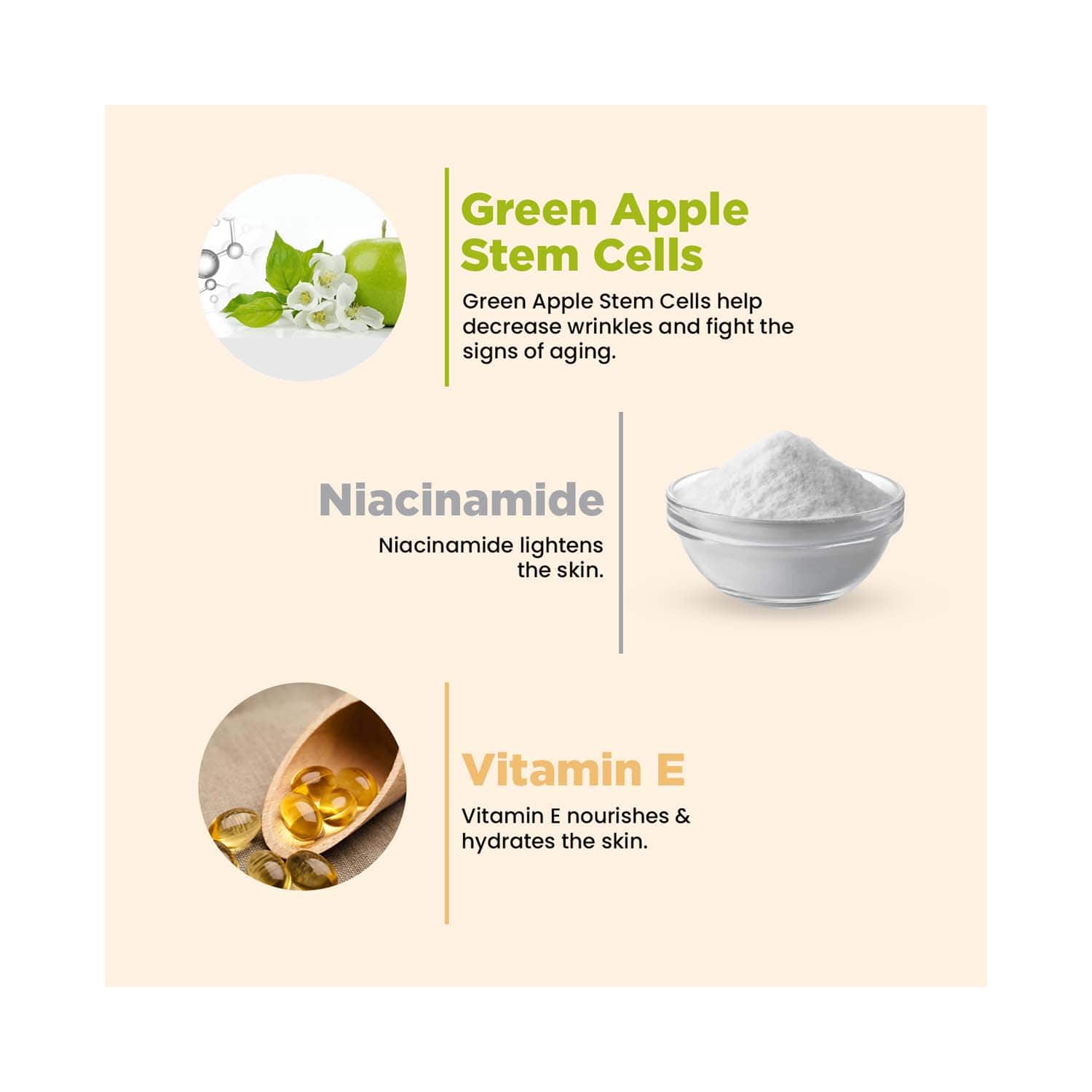 Key Ingredients:Green apple: Reduce dullness and signs of agingNiacinamide: Lightens and evens out the skin toneVitamin E: Nourishes, hydrates, and plumps the skin