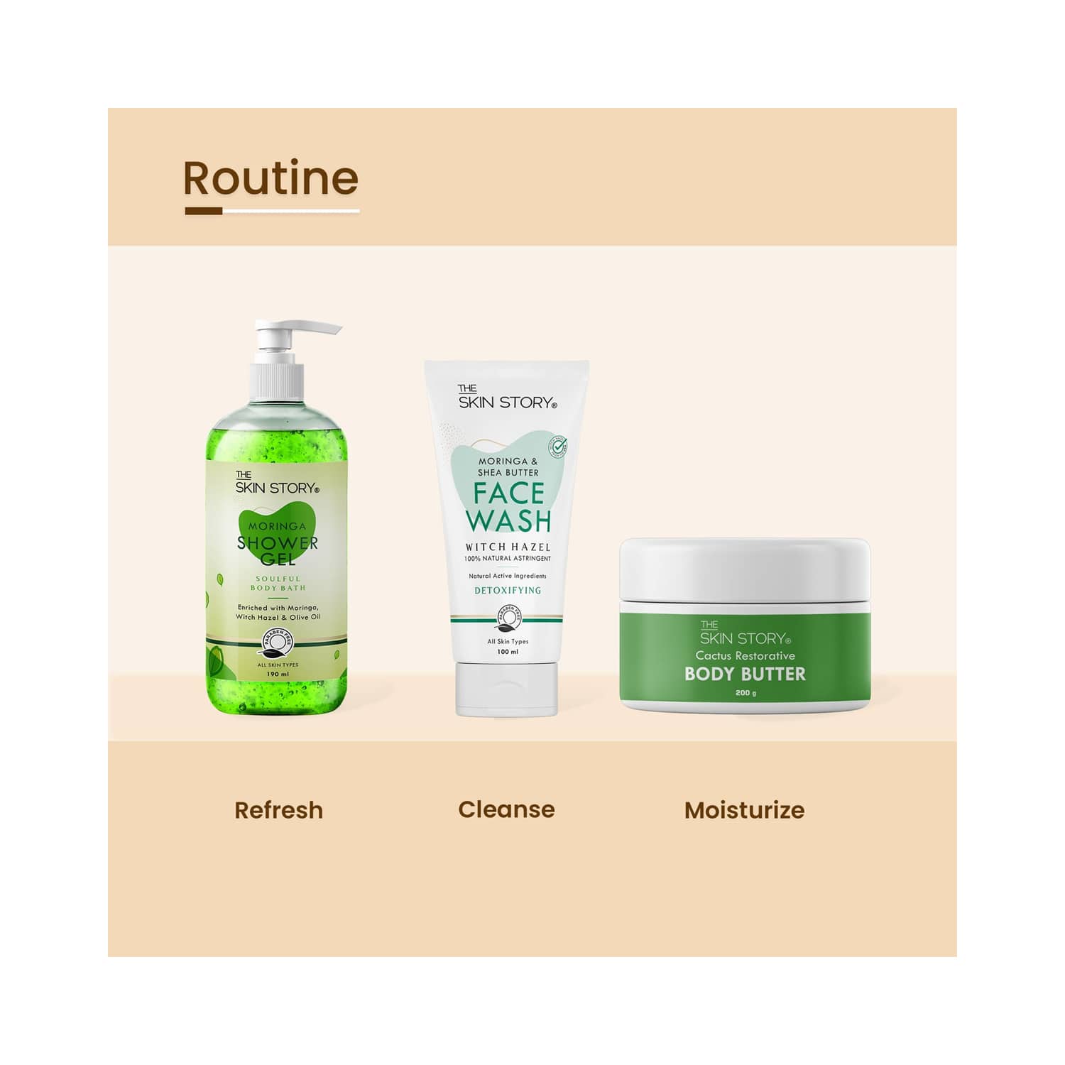 Change your bathing regime with the The Skin Story Reviving Moringa Shower Gel (190ml). This nourishing shower gel contains witch hazel, moringa oil, and shea butter to make your skin feel soft and hydrated. It has a fragrant lather that gently foams to refresh and moisturize your skin. Plus, the formulation of this The Skin Story shower gel suits all skin types, so you can use it daily without worrying about any reaction.Key Features & Benefits:Contains witch hazel, moringa oil, and shea butter to soften and nourish your skinProvides a gentle foaming action for deep skin cleansingFragrant lather invigorates sensesSuitable for all skin typesKey Ingredients:Witch hazel, moringa oil, and shea butter: Hydrate and nourish skinAll Ingredients:Aqua, Sodium Lauryl Ether Sulphate, Acrylates Copolymer, Cocamidopropyl Betaine, Sodium Lauroyl Sarcosinate, Glycerin, Perfume, Cocamide Dea, Olive Oil, Glycereth-8 Esters, Propylene Glycol, Peg-40, Hydrogenated Castor Oil, Sodium Pca, Moringa Oleifera (Moringa) Extract, Hamamelis Virginiana (Witch Hazel) Extract, Sodium Hydroxide, Benzophenone 4, Disodium Edta, Xanthan Gum, Methylchloroisothiazolinone, Methylisothiazolinone, Cellulose, Lactose, Hydroxypropyl Methyl Cellulose, Ci.19140, Ci.42090.How to Use:Take the bottle and pump a small amount of gel into a loofah. Gently rub it on your body and create a rich lather. Finally, rinse it off with water and pat dry.About the Brand:Founded by Ravina Jain in 2019, The Skin Story is a skincare brand that provides natural and effective skincare products that cater to different skin types and concerns. Their products are formulated with carefully chosen ingredients and are free from harmful chemicals and animal testing. The brand aims to promote healthy skin and hair with its range of products, including cleansers, toners, serums, shampoos, conditioners, moisturizers, and more.Check out more The Skin Story Body Wash & Shower Gel options here, or browse through tokocart's full range of Body Wash & Shower Gel from top global brands.You can also explore other products from the world of The Skin Story here on tokocart.