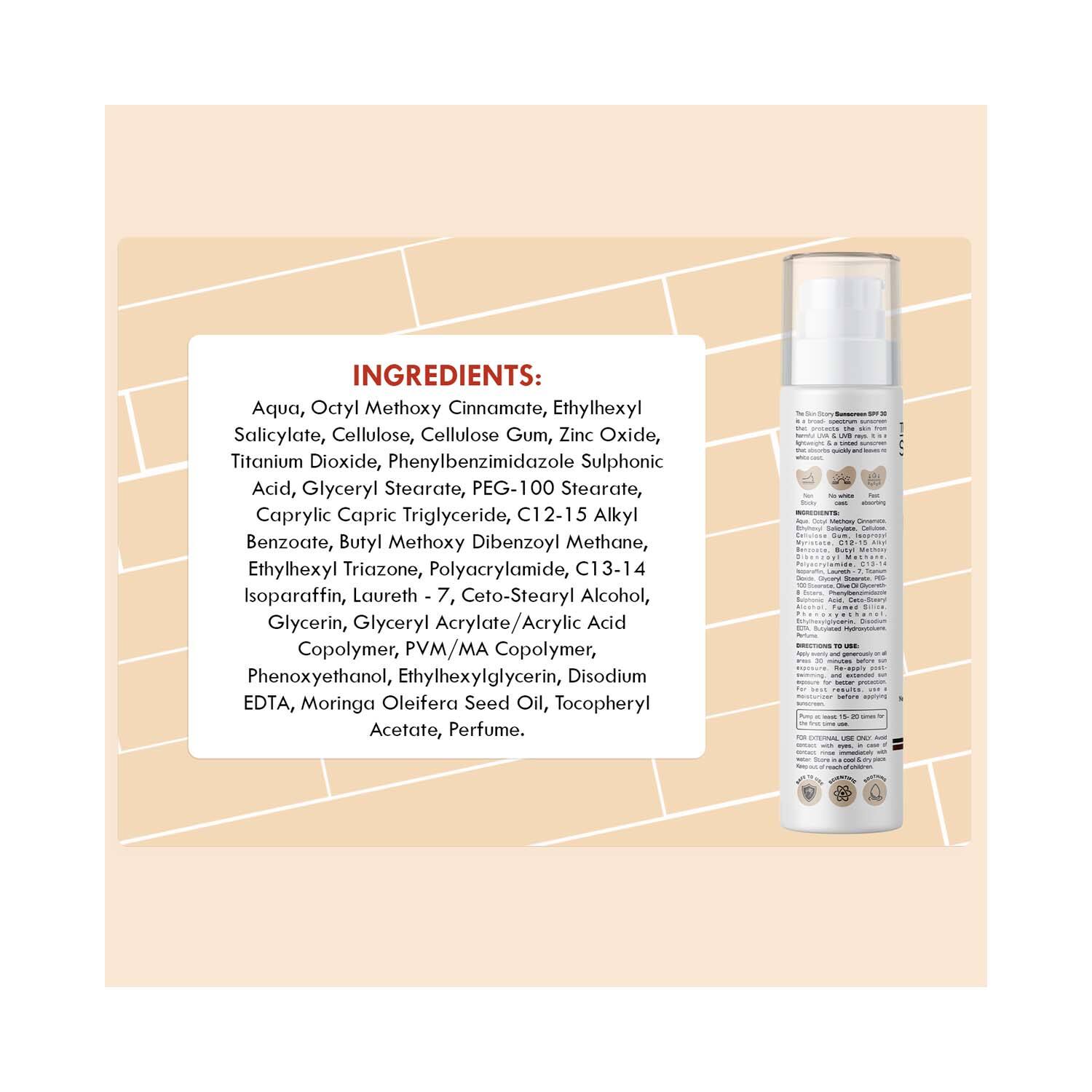 Use the The Skin Story Sunscreen SPF 30 (40g) and face the sun with confidence. This SPF 30 sunscreen has zinc oxide to protect the skin. It is a lightweight sunscreen with moringa to fight sun-induced aging and dark spot formation. The matte finish adds radiance, and its waterproof formula makes this The Skin Story tinted sunscreen the ideal choice for all-day protection.
