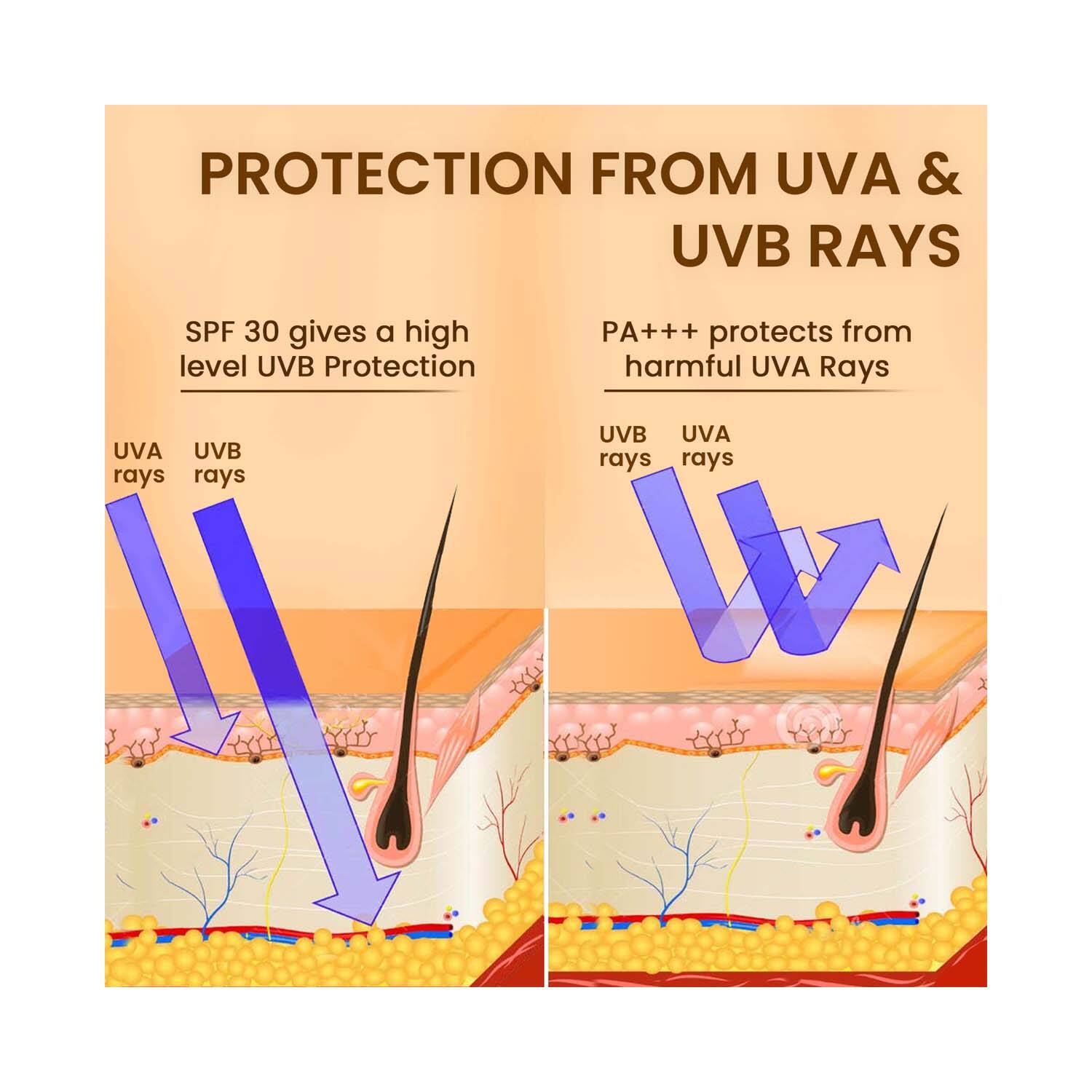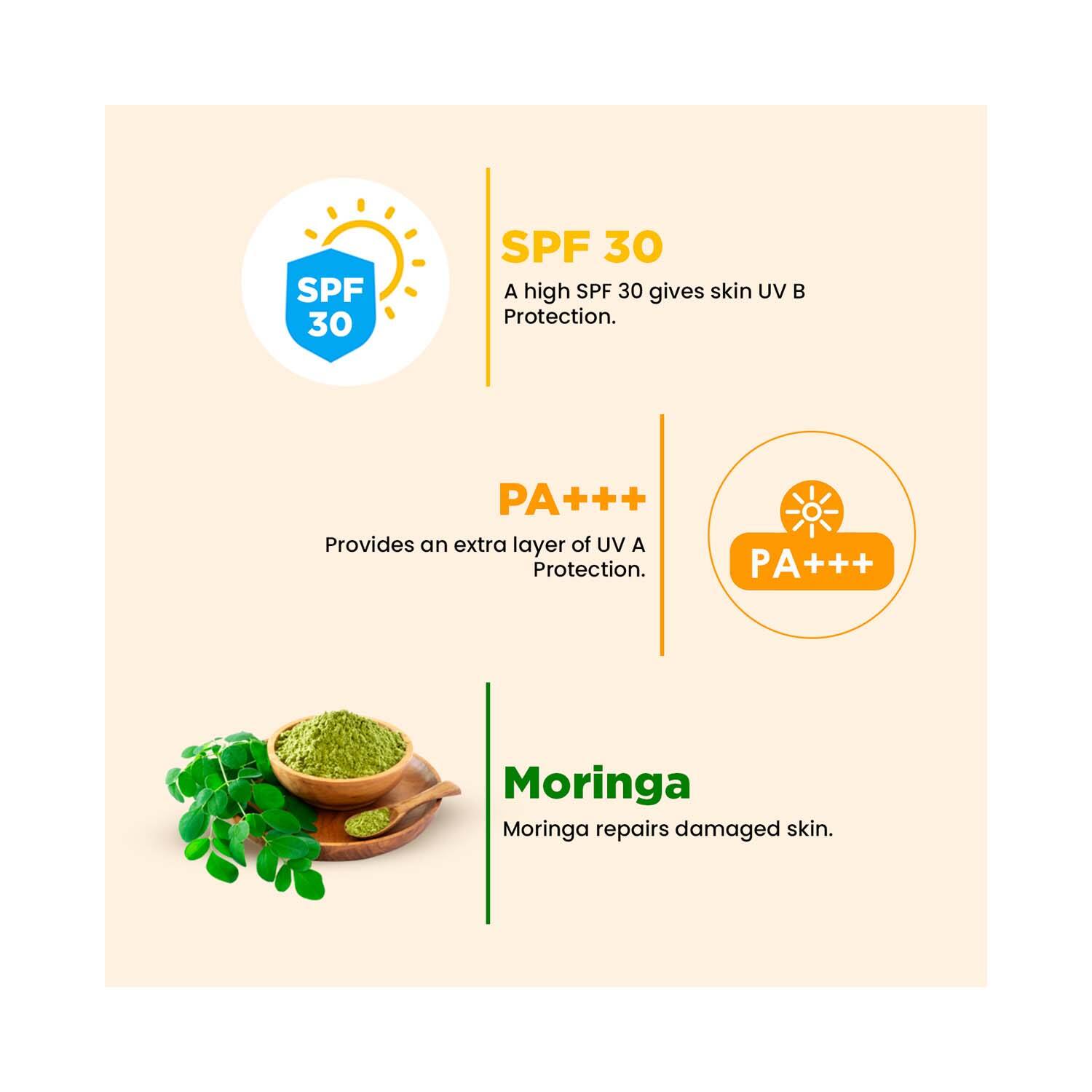 Key Ingredients:Zinc oxide: Creates a physical barrier between the skin and the sunTitanium dioxide: Prevents sun damage and reduces the signs of agingMoringa: Flushes out toxins from the skin