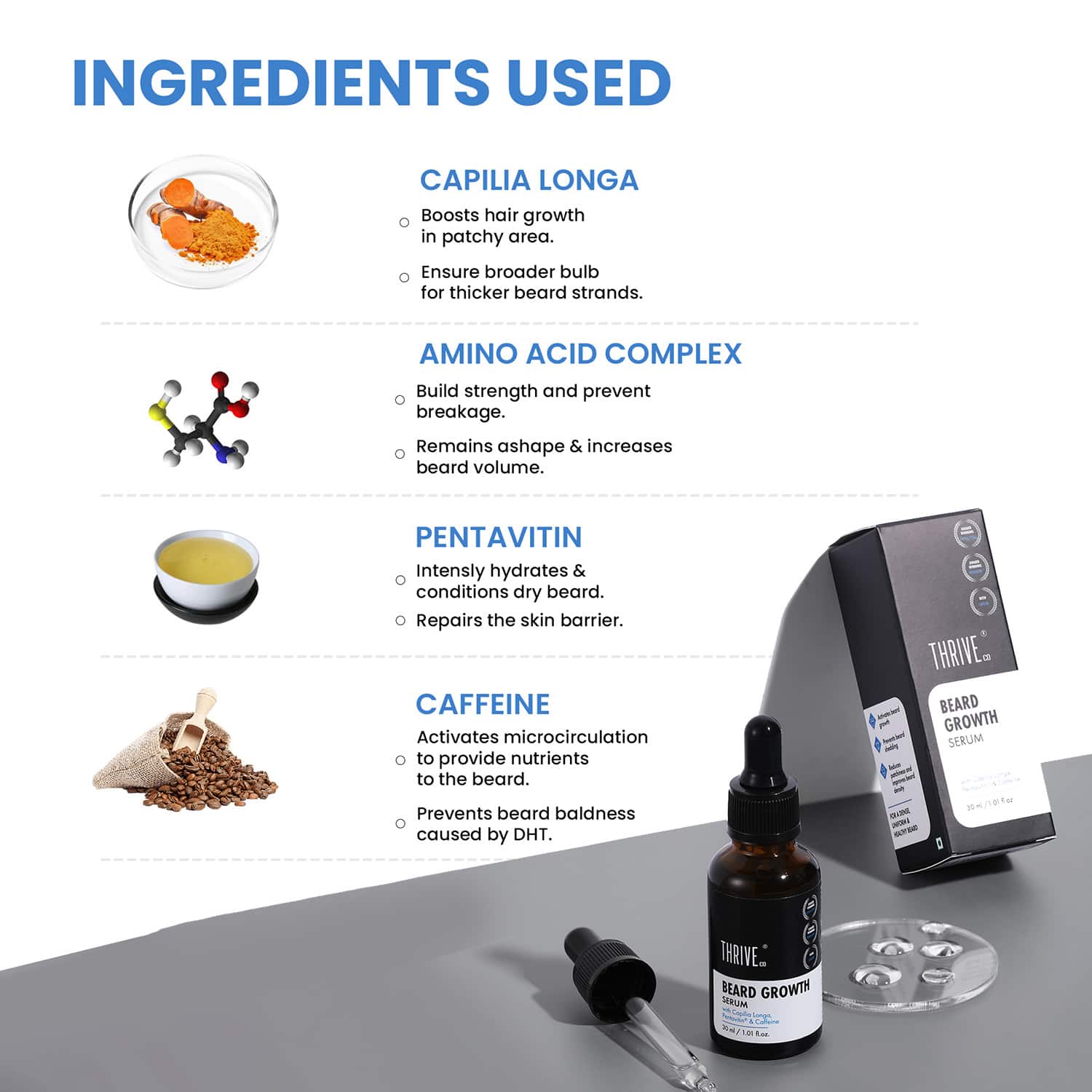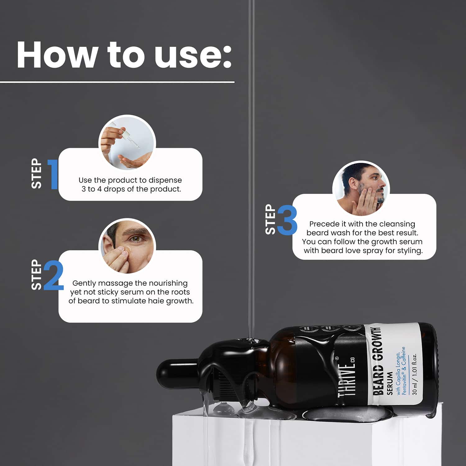 Add growth, volume, and density to your beard with the ThriveCo Beard Growth Serum (30ml). Formulated with award-winning ingredients, this serum promotes hair fullness. It activates the hair stem cells to increase hair growth in scanty areas for uniform stubble. This ThriveCo beard serum conditions beard hair and repairs skin irritation or flakiness.Key Features & Benefits:Non-sticky serum moisturizes each strand for a smoother beardCaffeine makes the beard healthy and shinyAmino acid complex lends keratin levels and hence helps increase beard volumeCapilia longa promotes healthy beard growth in scanty areasKey Ingredients:Pentavitin: Moisturizes beard hairCaffeine: Makes the beard healthy and shinyAmino acid complex: Increases beard volumeCapilia longa: Promotes beard growth in scanty areasHow to Use:Generously apply the serum all over the beard. Massage well for 30 seconds.About the Brand:ThriveCo is a brand from Anveya Living Pvt. Ltd. It focuses on educating and creating highly clinical, clean, effective, and regiment-based products that provide a solid solution for hair and skin concerns. This brand keenly observed the hair and skin concerns of the Indian population. After years of brainstorming and global research, they came up with the best international innovation in skin and hair products that fits perfectly to suit Indian consumers.Check out more Thriveco Beard Serum options here, or browse through tokocart's full range of Beard Serum from top global brands.You can also explore other products from the world of Thriveco here on tokocart.