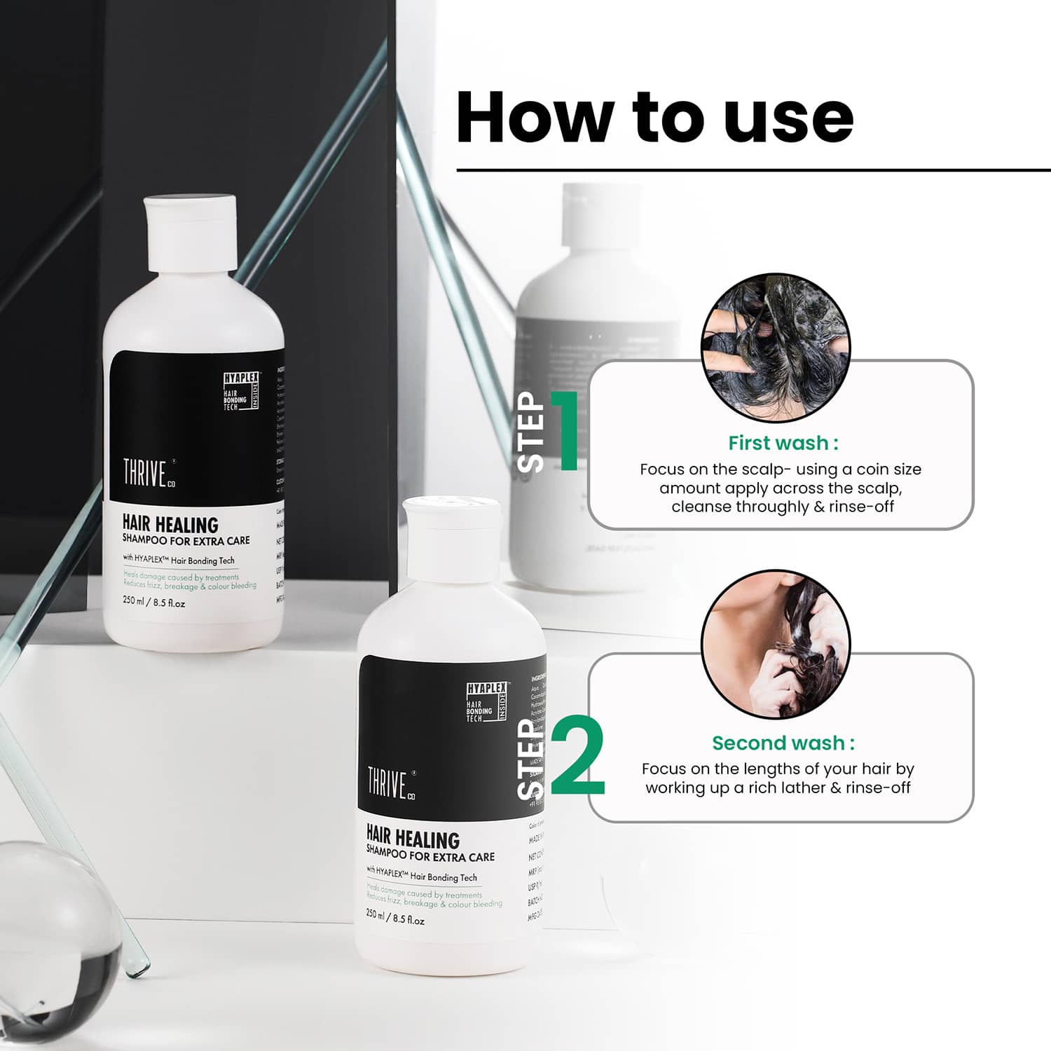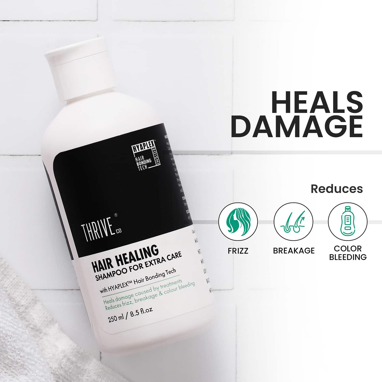 Breathe life back into your locks with the ThriveCo Hair Healing Shampoo (250ml). This damage reversal shampoo is formulated for hair damaged by chemical and thermal treatments. Also, this ThriveCo shampoo has hyaplex technology that repairs hair at a molecular level by rebuilding the broken bonds and strengthening the hair from within. Plus, it provides instant respite from frizz, breakage, and color bleeding.