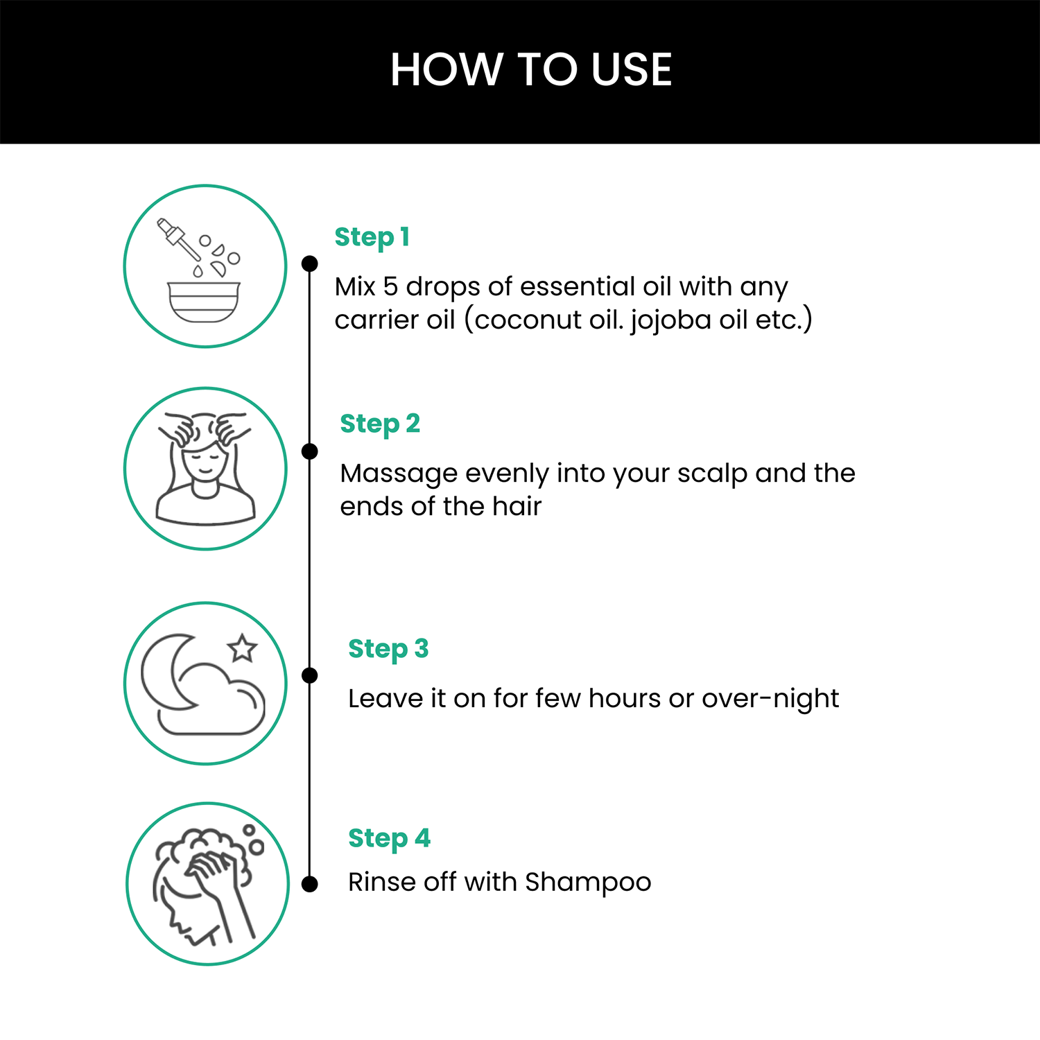 How to Use:Mix 5 drops of the essential oil with a carrier oil. Massage the mixture into your scalp and the length of your hair. Leave it on for a few hours or overnight, then wash it off thoroughly.