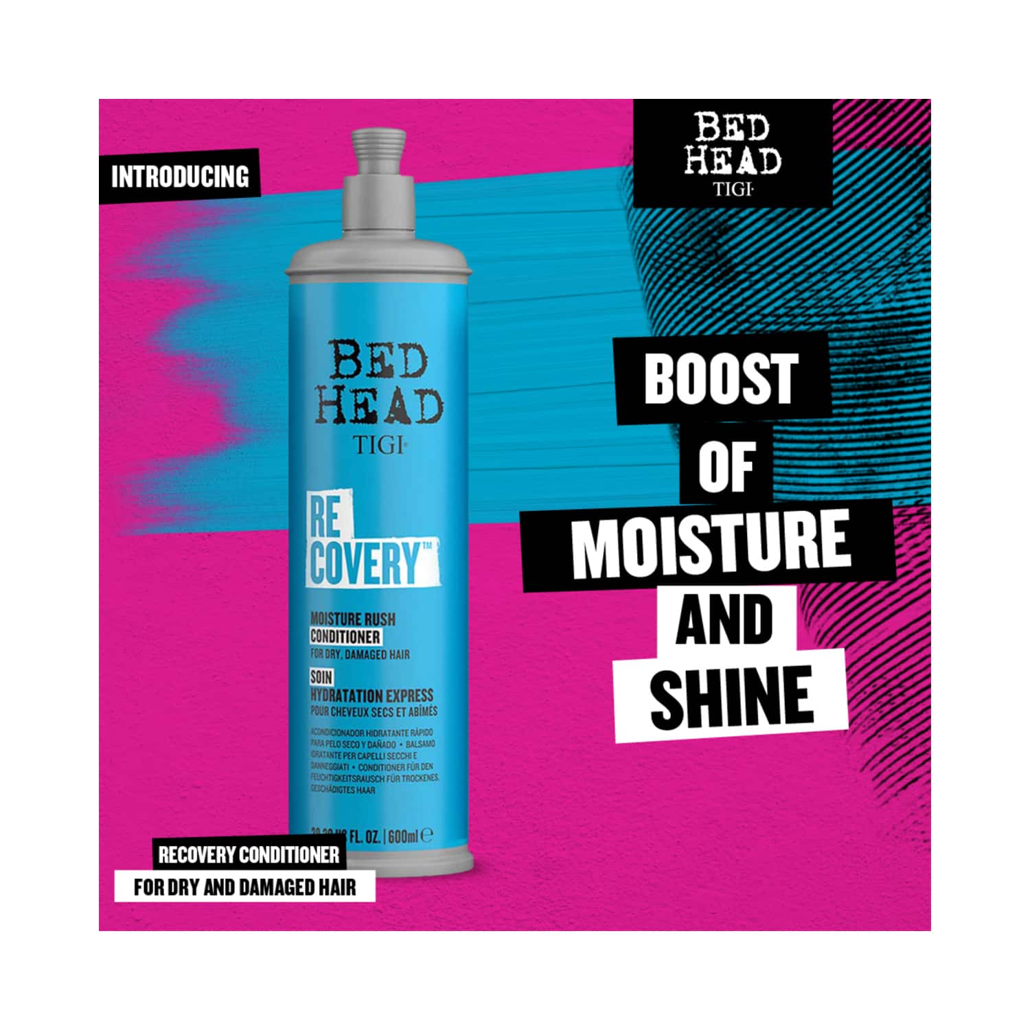 Unlock the secret to silky, smooth hair with the Tigi Bed Head Recovery Moisture Rush Hair Conditioner For Dry & Damaged Hair (600ml). This nourishing conditioner is formulated with silicones to soften the and add shine while the amodimethicone smoothens the hair to tame frizz. Plus, the dipropylene glycol in this Tigi hair conditioner nourishes and hydrates the hair, and prickly pear cactus extract heals damage. Moreover, this conditioner deeply moisturizes dried-out hair.Key Features & Benefits:Formulated with dipropylene glycol to provide an extra boost of moisture and bounce to lifeless hairInfused with pear cactus extract to deeply heal hair damageHas a zesty and energizing fragrance to refresh the hair and sensesSuitable for use on all hair types, even for colored hairKey Ingredients:Pear cactus extract: Has healing properties and nourishes brittle hairAll Ingredients:Water (Aqua/Eau), Cetearyl Alcohol, Dimethicone, Stearamidopropyl Dimethylamine, Behentrimonium Chloride, Fragrance (Parfum), Glycerin, Lactic Acid, Dipropylene Glycol, Amodimethicone, Sodium Benzoate, Potassium Chloride, Opuntia Ficus-Indica Extract, Disodium Edta, Peg-7 Propylheptyl Ether, Phenoxyethanol, Propylene Glycol, Cetrimonium Chloride, Benzyl Benzoate, Geraniol, Limonene, Linalool, Blue 1 (Ci 42090), Yellow 5 (Ci 19140).How to Use:Shampoo your hair and rinse off well. Apply a small amount of conditioner to your scalp and hair strands. Leave it for 1 minute and rinse well for softer and bouncier hair.About the Brand:TIGI, short for "Toni & Guy, " is a British hair care and styling brand that the Mascolo family founded. TIGI was founded by the Mascolo family, specifically by brothers Toni Mascolo and Guy Mascolo. The first TIGI salon opened in London in 1963, and the brand gradually expanded its global presence. The brand is known for its innovative hair products, professional styling tools, and creative hair care and fashion approach. It offers an extensive selection of hair care and styling items designed to suit a variety of hair types and requirements. Their range of products encompasses shampoos, conditioners, styling creams, hairsprays, and serums.Check out more TIGI Conditioner options here, or browse through tokocart's full range of Conditioner from top global brands.You can also explore other products from the world of TIGI here on tokocart.