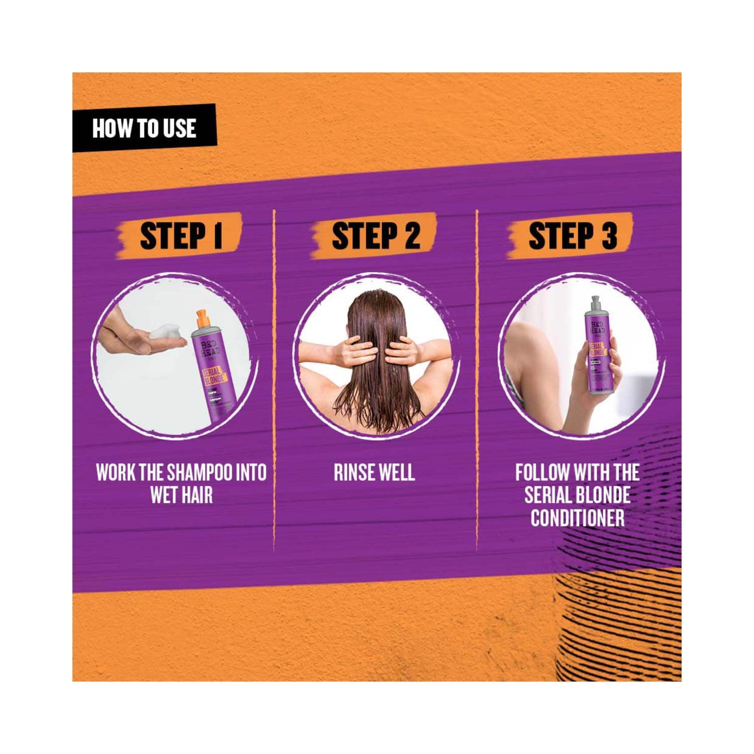 Level up your blonde hair game with the Tigi Bed Head Serial Blonde For Blonde Colored & Damaged Hair Restoring Conditioner (400ml). Packed with keratin and glycerin, this color protect conditioner keeps your hair healthy while retaining the vibrancy of your colored locks. As an anti-frizz conditioner, it shields against hair fall and breakage while preventing static. This TIGI hair conditioner reduces flyaways and frizz to improve manageability and smoothen hair texture.