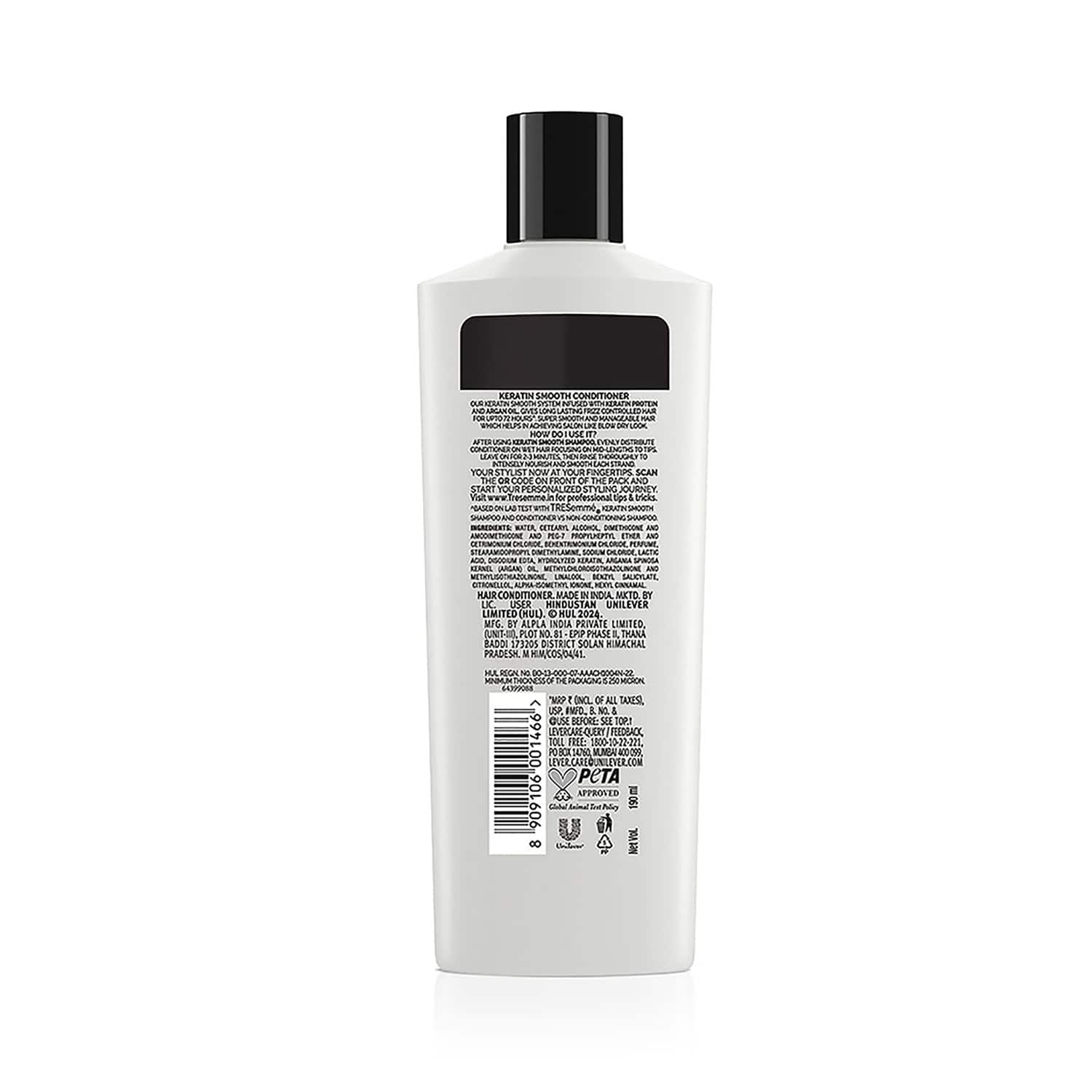 Get shining hair with the Tresemme Keratin Smooth Conditioner - (190ml). This dual-action conditioner soothes high, leaving your hair appearing smooth and frizz-free. Infused with lightweight argan oil, this conditioner nourishes your hair and makes them manageable. It also protects against dryness and makes hair softer.Key Features & Benefits:Infused with lightweight argan oil to nourish dry hairConditioner smoothens and straightens hairSmoothening conditioner offers upto 100% more softness with shineCruelty-free conditioner suits both natural and chemically treated hairKey Ingredients:Argan oil: Smoothens hair, adds shine, and protects against drynessHow to Use:Starting with Shampoo, followed by conditioner, apply an adequate amount of it to wet hair from mid-lengths to ends. Leave it for 2-3 minutes and rinse it with water.All Ingredients:Water, Cetearyl Alcohol, Behentrimonium Chloride, Dimethicone, Perfume, Dipropylene Glycol, Stearamidopropyl Dimethylamine, Amodimethicone, Sodium Chloride, Lactic Acid, Disodium Edta, Cyclotetrasiloxane, Phenoxyethanol, Peg-7 Propylheptyl Ether, Cetrimonium Chloride, Magnesium Nitrate, Hydrolyzed Keratin, Butyrospermum Parkii (Shea) Butter, Sclerocarya Birrea Seed Oil, Argania Spinosa Kernel Oil, Simmondsia Chinensis (Jojoba) Seed Oil, Lysine Hcl, Methylchloroisothiazolinone, Magnesium Chloride, Methylisothiazolinone, Potassium Sorbate, Acetic Acid +Hydrolyzed Keratin (Sheep Wool Source)About the Brand:Founded by Edna L. Emme in the year 1948, TRESemme is dedicated to creating hair care and styling products that are salon quality without the salon price. The brand promotes the values of independence, self-reliance, and most importantly, the confidence every woman needs to step up and meet the next challenge. TRESemme believes that every woman deserves to look and feel fabulous like they've just stepped out of the salon. All their products use the latest technology to help you create stunning hairstyles and experience that salon feeling every day.Check out more Tresemme Conditioner options here, or browse through tokocart's full range of Conditioner from top global brands.You can also explore other products from the world of Tresemme here on tokocart.