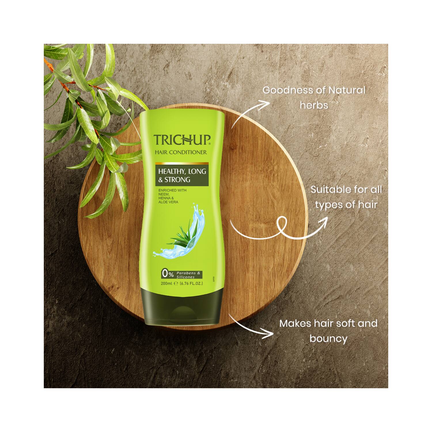 Get damage-free hair with the Trichup Healthy Long & Strong Conditioner (200ml). This neem hair conditioner nourishes the hair and helps with easy hair detangling. It is an anti-frizz conditioner that reduces hair frizziness and roughness. The Trichup hair conditioner is also a nourishing conditioner that provides soft and strong hair.Key Features & Benefits:Infused with aloe vera to nourish the hairMoisturizing conditioner provides soft and tangle-free hairHair-strengthening conditioner provides strong hairFree from paraben and silicone for safe useKey Ingredients:Aloe vera: Nourishes the hairHenna: Promotes hair growthHow to Use:Shampoo your hair and rinse off well. Apply a small amount of conditioner to your scalp and hair strands. Leave it for 1 minute and wash off with water for softer and bouncier hair.About the Brand:Trichup, a flagship brand of Vasu Healthcare, was founded in the year 1990. They create hair care products that address various hair problems, including hair loss, dandruff, and dry, dull, and frizzy hair. Their products include oils, shampoos, serums, hair creams, and much more. Each brand product is made of natural and potent herbs, making it a brand trusted and recommended by doctors. In addition, Trichup products are also free of chemicals to ensure safe and long-term usage.Check out more Trichup Conditioner options here, or browse through tokocart's full range of Conditioner from top global brands.You can also explore other products from the world of Trichup here on tokocart.