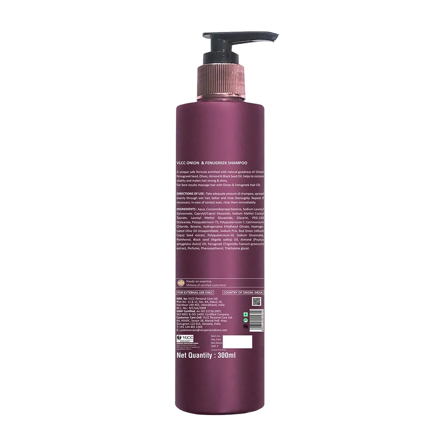 Let your hair make a bold statement with care from the VLCC Onion + Methi Shampoo from VLCC Your hair care gets the much needed Strength, Moisture with this shampoo. Being Paraben Free, SLS/SLES Free, Cruelty Free, this product is a great buy Key ingredients include Red Onion Seed Extract, Black seed Oil and Almond Oil.Key Features & Benefits:Onion and fenugreek hair oil that promotes hair growth and reduces hair fall.Enriched with the goodness of onion, fenugreek and almond oil.Stimulates hair growth for thicker and more voluminous hair.Improves strength and texture of the hair.Suitable for all hair types.Free from parabens, sulphates, mineral oils and silicone.This product is cruelty-free.How to Use:Take an adequate amount of shampoo, spread evenly through wet hair, lather and rinse thoroughly.Repeat if necessary.In case of contact with eyes, rinse them immediately.All Ingredients:Red Onion Seed Extract, Black seed Oil, Almond Oil, Fenugreek Extract.About the Brand:VLCC aspires to transform lives by making Beauty & Wellness accessible to all.Check out more VLCC Shampoo options here, or browse through tokocart's full range of Shampoo from top global brands.You can also explore other products from the world of VLCC here on tokocart.